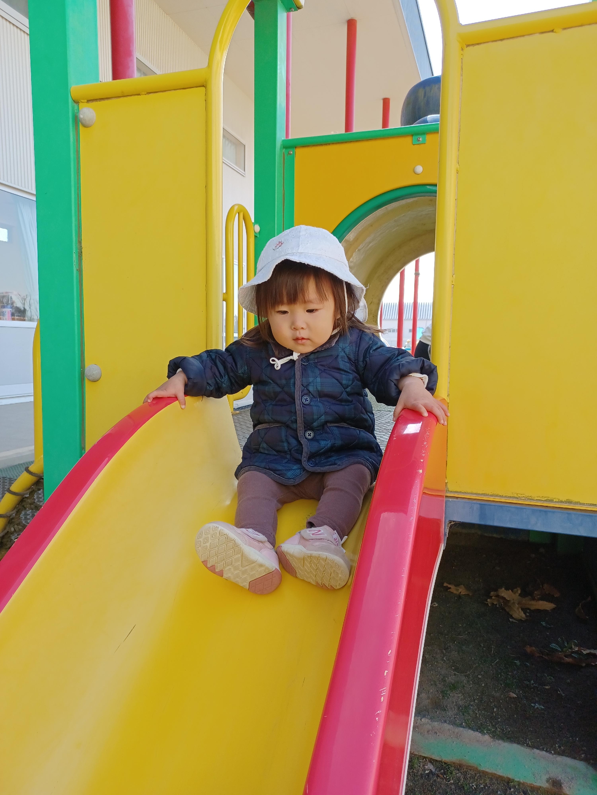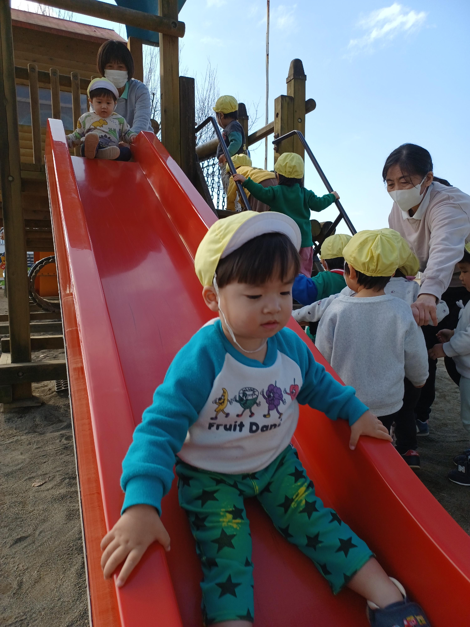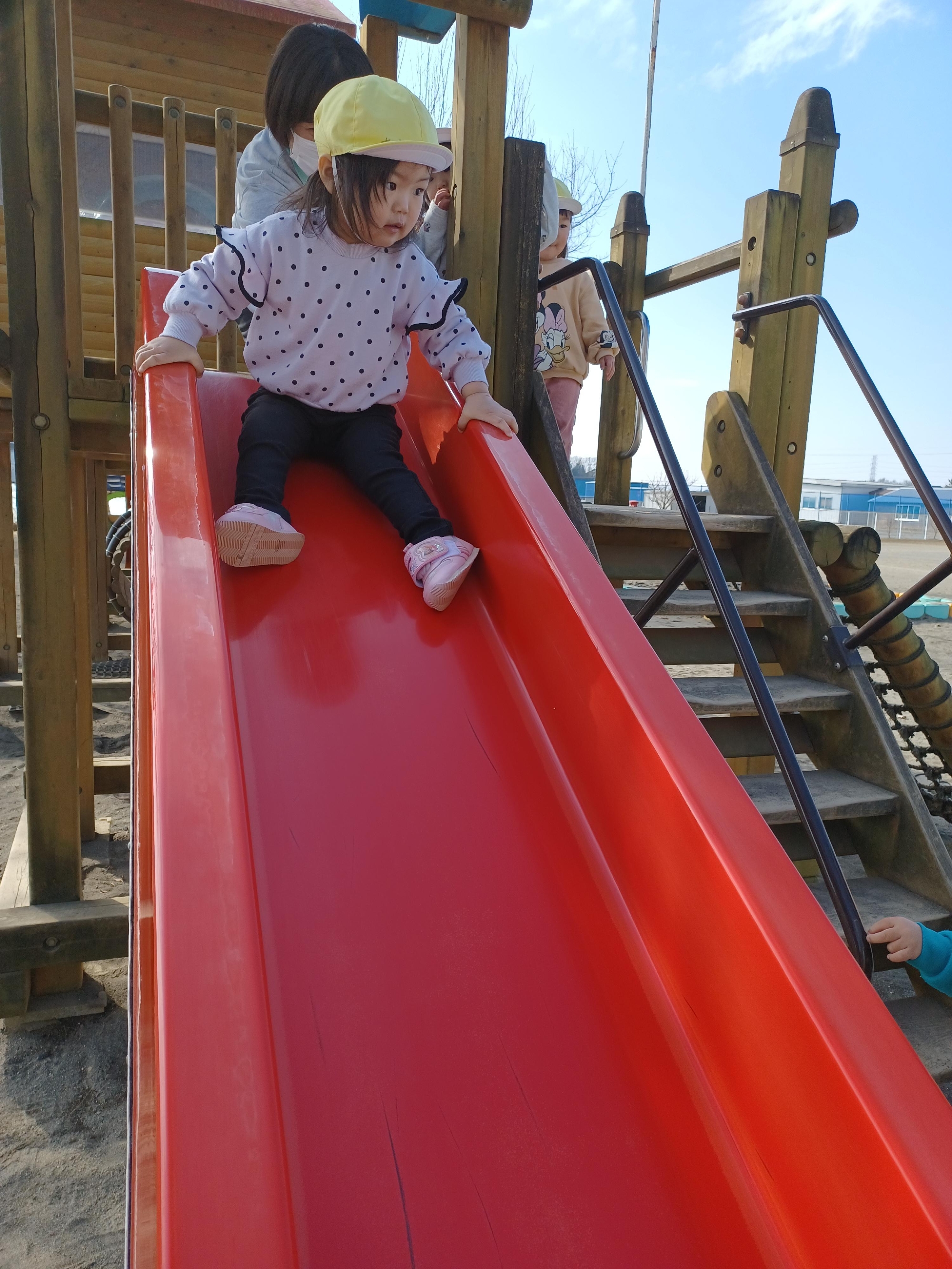赤い滑り台は初めての遊具なので、約束事をしっかり聞いて滑ります✌