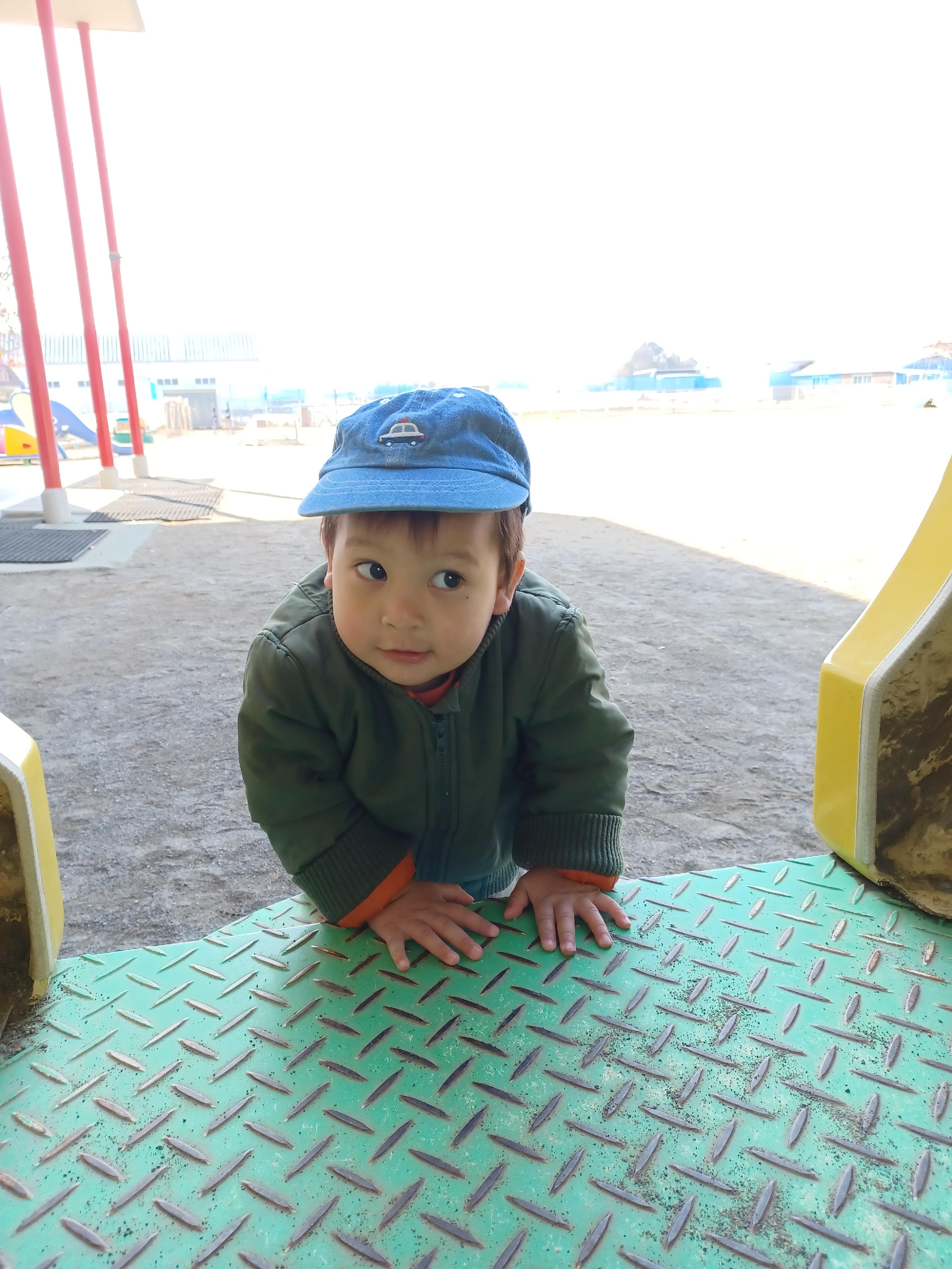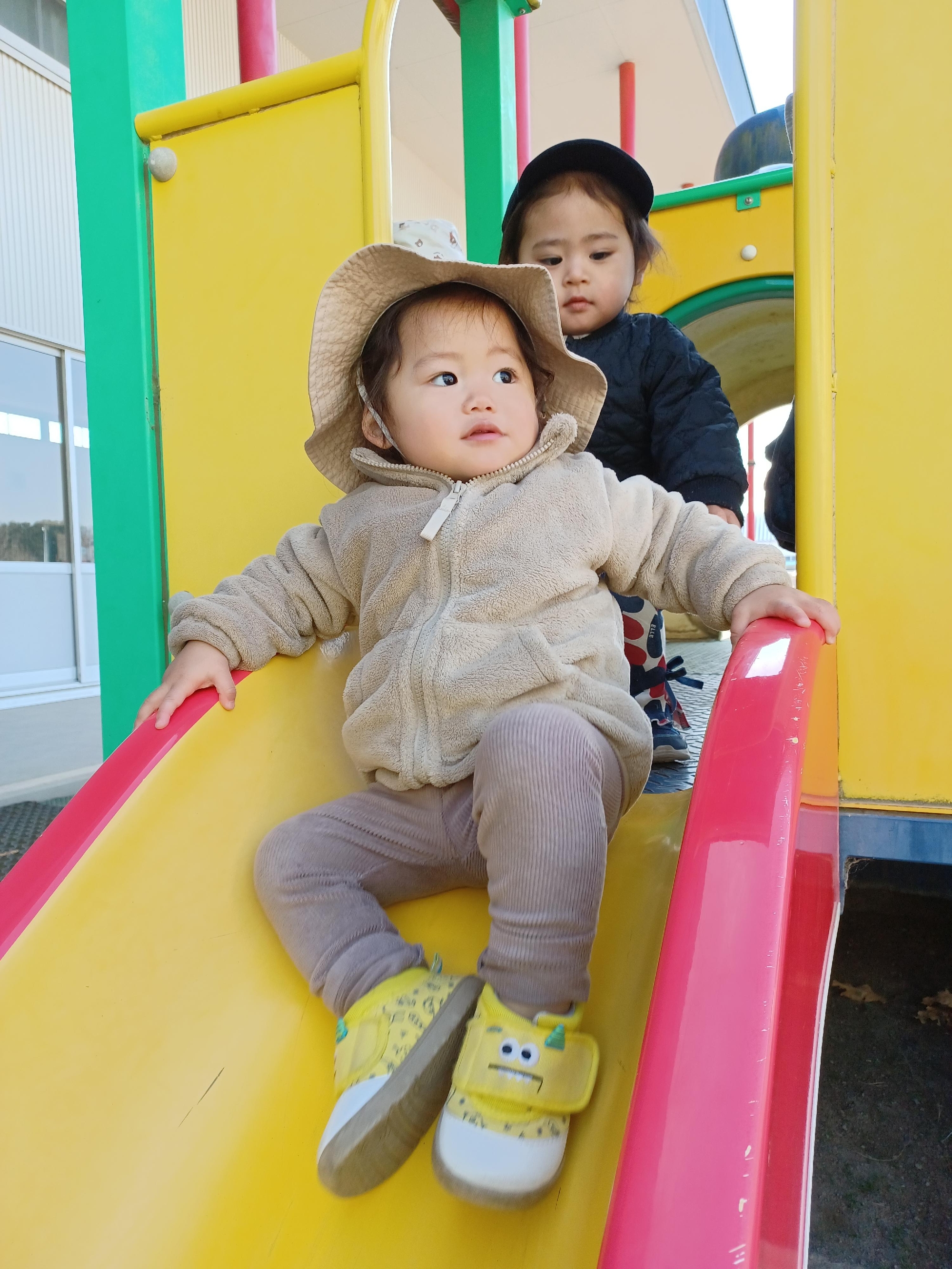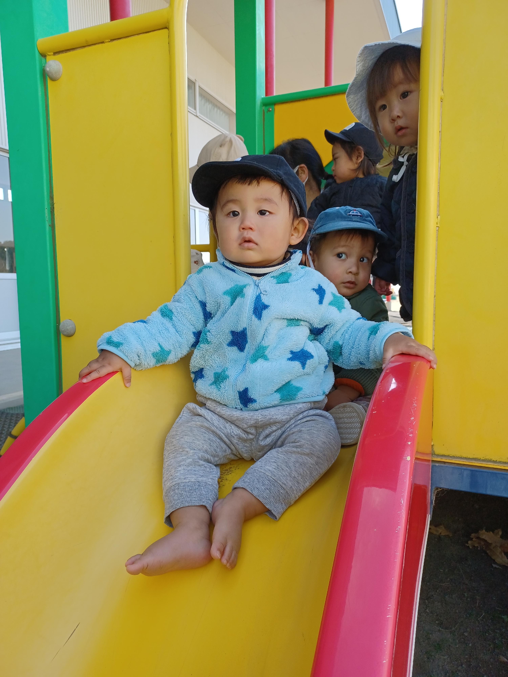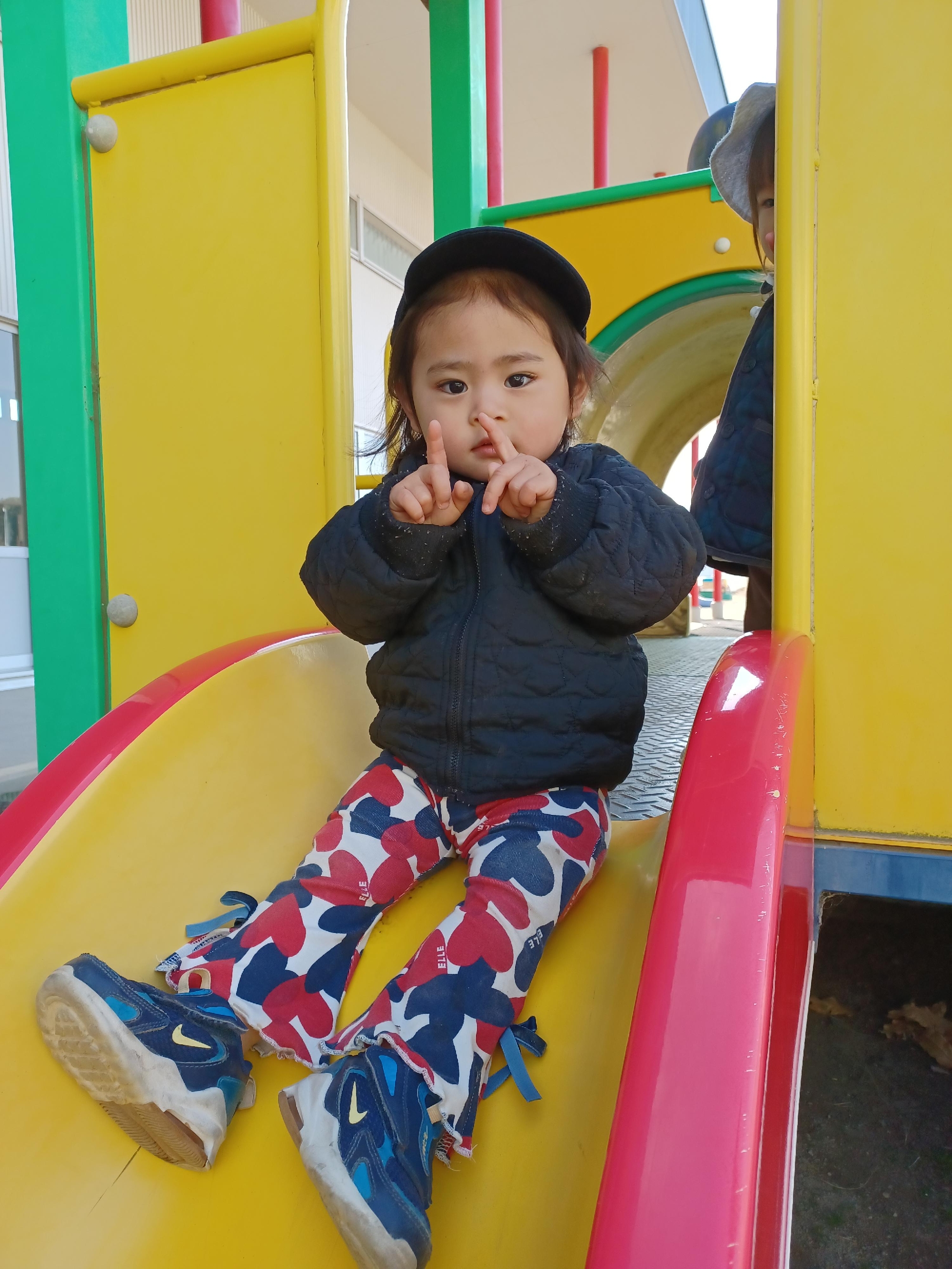 赤い滑り台は初めての遊具なので、約束事をしっかり聞いて滑ります✌